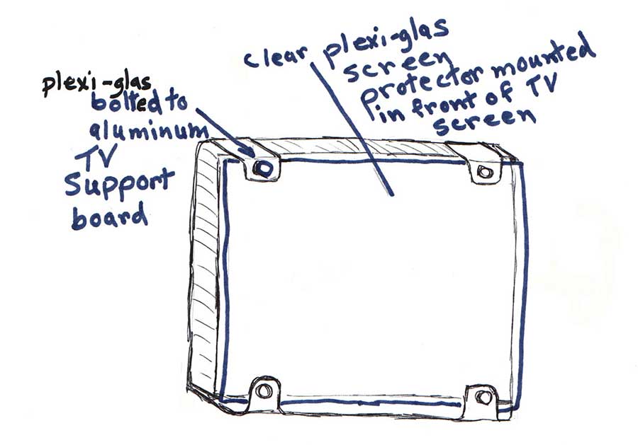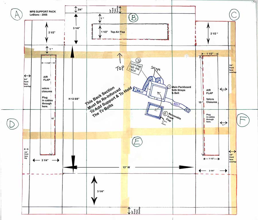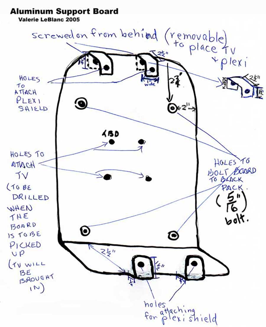 The MPB went through several changes during the research and development until a convenient and functional DYI unit was achieved. The MediaPackBoard consists of a flat-screen television monitor mounted on a supporting backpack unit. Through the use of a camcorder, the wearer is able to screen (playback) pre-recorded videos on the backpack MPB TV unit or, through the use of the camera, to interact with the public while simultaneously displaying that interaction. When the audience member becomes the featured attraction on the television monitor, the MPB presenter becomes a kind of host or member of the audience as well. The wearer is not able to see the TV screen but is able to know what is appearing on her / his back by following the action through the camcorder viewfinder. A compact 12-volt battery and DC to AC power inverter connected to the TV make the portability of this itinerant gallery/screening/performance unit possible. The 12-volt battery has the popular ‘cigarette lighter’ adaptor used to power small chargers in cars. The battery features a ‘flash warning’ when the power is getting low, it cuts in and out a few times. When this happens, you have to shut down the whole unit as the LCD TV could sustain damage if the battery power is allowed to completely drain. Fully charged, the battery will last slightly longer than an hour. The inverter has a matching cigarette lighter adaptor and a three-prong plug-in to accommodate the TV connection. A clear Plexiglas shield in front of the TV screen is a good idea. (Easier to replace than a TV) The entire MPB apparatus weighs approximately 30 lb. (About 14 kg)